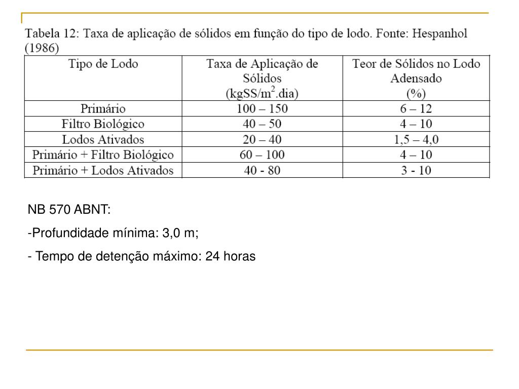 NB 570 ABNT: • Profundidade mínima: 3,0 m; • Tempo de detenção máximo: 24 horas