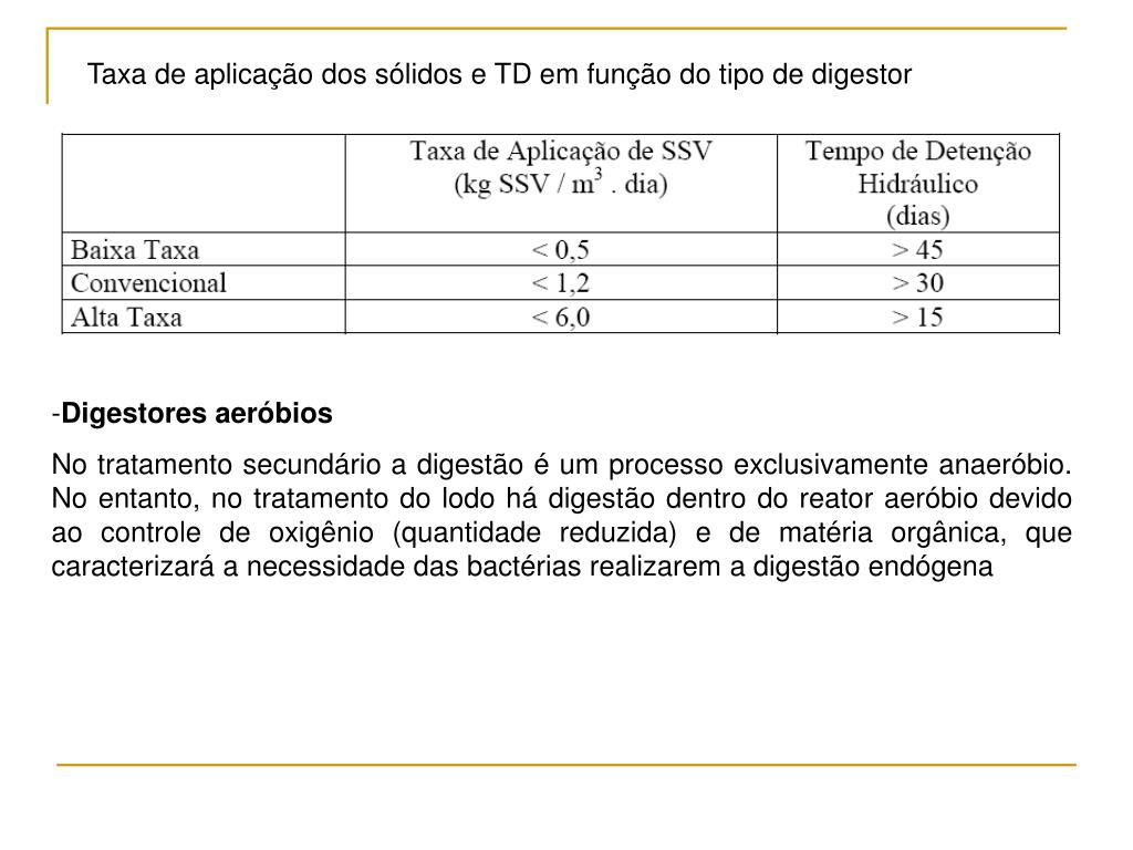 Taxa de aplicação dos sólidos e TD em função do tipo de digestor • Digestores aeróbios • No tratamento secundário a digestão é um processo exclusivamente anaeróbio. No entanto, no tratamento do lodo há digestão dentro do reator aeróbio devido ao controle de oxigênio (quantidade reduzida) e de matéria orgânica, que caracterizará a necessidade das bactérias realizarem a digestão endógena