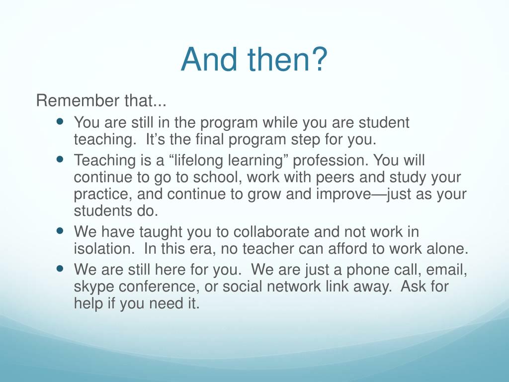 And then? Remember that... • You are still in the program while you are student teaching. It’s the final program step for you. • Teaching is a “lifelong learning” profession. You will continue to go to school, work with peers and study your practice, and continue to grow and improve—just as your students do. • We have taught you to collaborate and not work in isolation. In this era, no teacher can afford to work alone. • We are still here for you. We are just a phone call, email, skype conference, or social network link away. Ask for help if you need it.