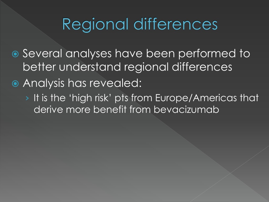 Regional differences • Several analyses have been performed to better understand regional differences • Analysis has revealed: • It is the ‘high risk’ pts from Europe/Americas that derive more benefit from bevacizumab