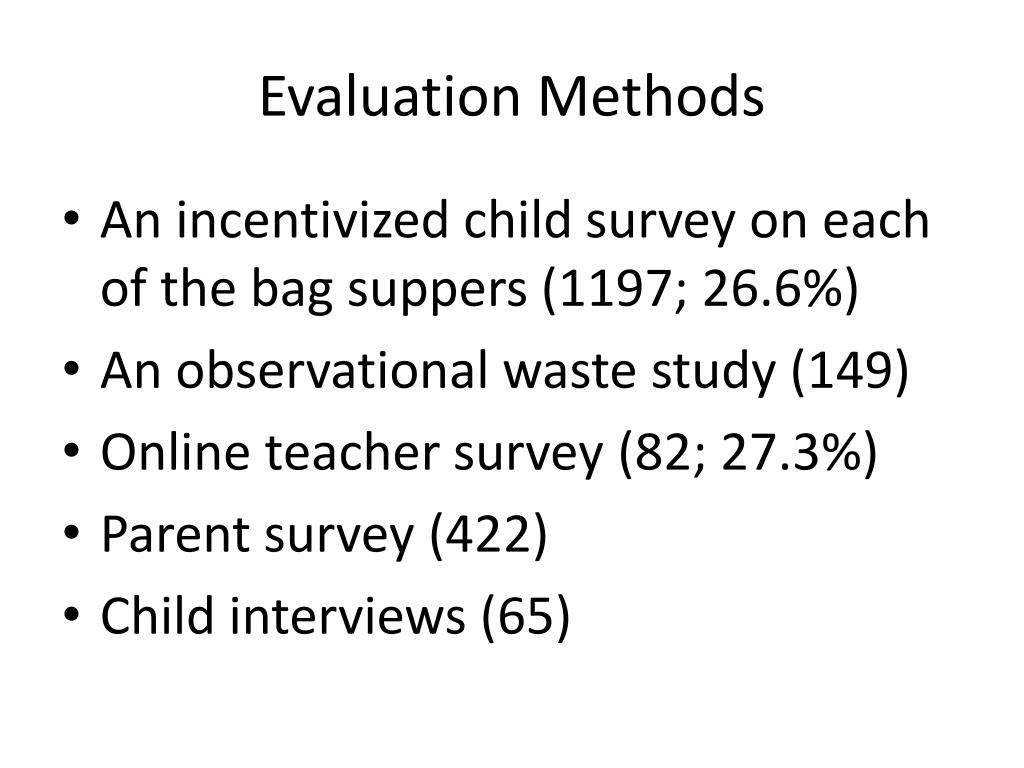 Evaluation Methods • An incentivized child survey on each of the bag suppers (1197; 26.6%) • An observational waste study (149) • Online teacher survey (82; 27.3%) • Parent survey (422) • Child interviews (65)