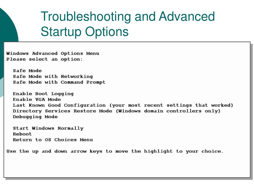 Troubleshooting and Advanced Startup Options (Page 3) • Contents of menu may include (con.): • Safe Mode with Command Prompt—same as above but not to the GUI environment • Enable Boot Logging—enables or disables boot process, and writes details to log file Ntbtlog.txt in %systemroot% folder • Records process of steps between boot menu and logon prompt which could provide clues to which driver, system or procedure is causing the problem