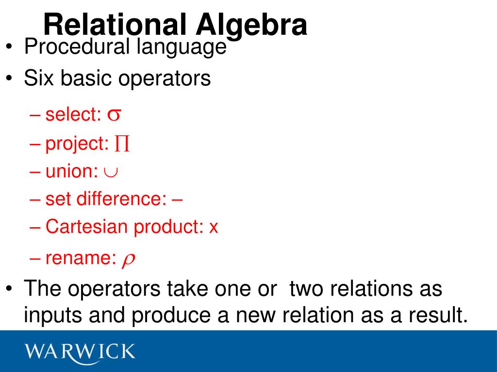 Relational Algebra Operators thus … • Procedural language with six basic operators • select: • project: • union: • set difference: – • Cartesian product: x • rename: • The operators take one or two relations as inputs and produce a new relation as a result.