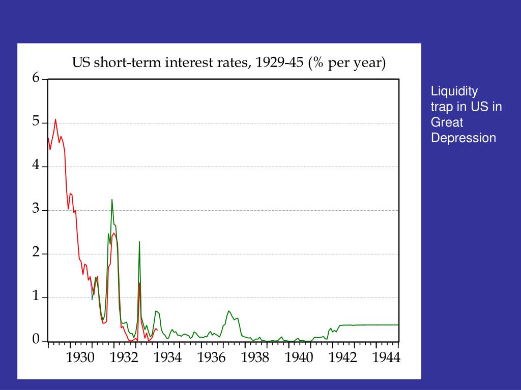 Key Elements in the Great Depression 1929-1933 • Started as asset price bubble and burst in 1920s • Gold standard hamstrung central banks from expansionary actions. • Collapse of investment and international trade after 1929 • Multiple bank failures through 1933 (standard panic model) • Unclear why so deep and persistent: low level equilibrium? • No effective fiscal policy until 1940 • Trough finally reached in 1933, but no sharp recovery • Recovery came only with fiscal expansion in World War II