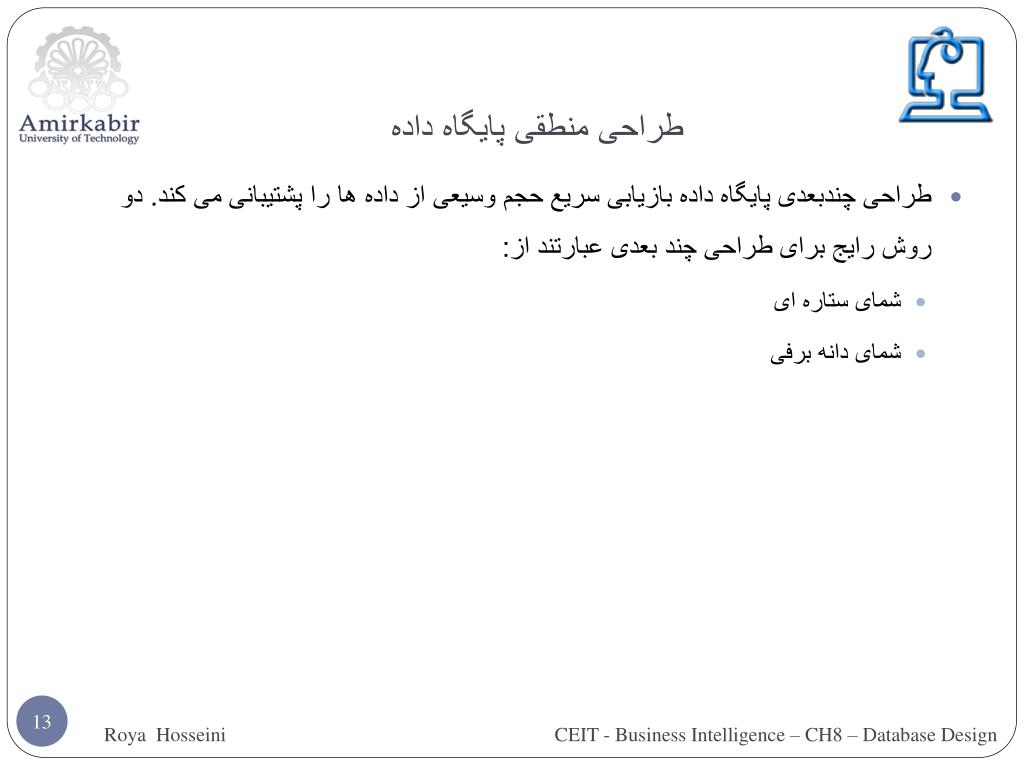 طراحی منطقی پایگاه داده • طراحی چندبعدی پایگاه داده بازیابی سریع حجم وسیعی از داده ها را پشتیبانی می کند. دو روش رایج برای طراحی چند بعدی عبارتند از: • شمای ستاره ای • شمای دانه برفی RoyaHosseini CEIT - Business Intelligence – CH8 – Database Design