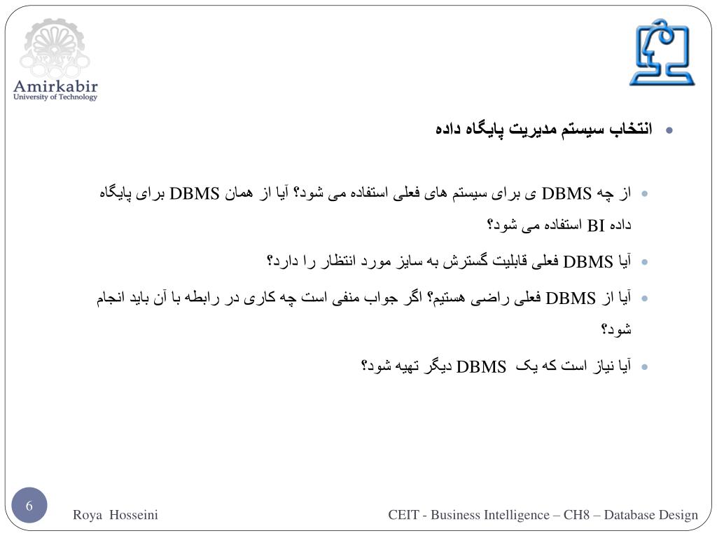 انتخاب سیستم مدیریت پایگاه داده • از چه DBMS ی برای سیستم های فعلی استفاده می شود؟ آیا از همان DBMS برای پایگاه داده BI استفاده می شود؟ • آیا DBMS فعلی قابلیت گسترش به سایز مورد انتظار را دارد؟ • آیا از DBMS فعلی راضی هستیم؟ اگر جواب منفی است چه کاری در رابطه با آن باید انجام شود؟ • آیا نیاز است که یک DBMS دیگر تهیه شود؟ RoyaHosseini CEIT - Business Intelligence – CH8 – Database Design
