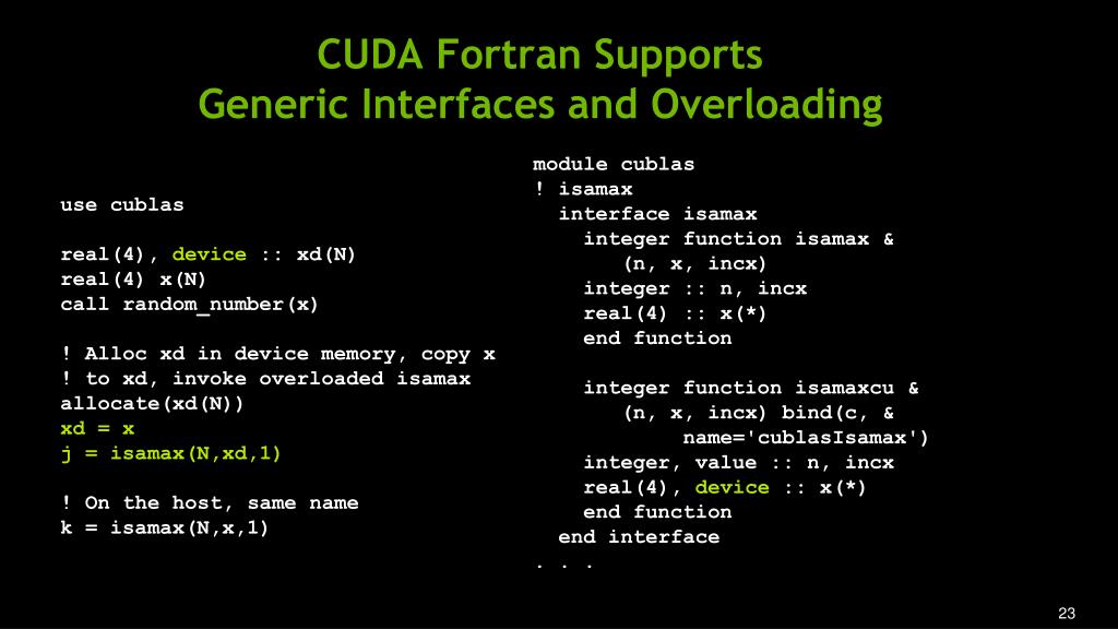 CUDA Fortran Supports Generic Interfaces and Overloading use cublas real(4), device :: xd(N) real(4) x(N) call random_number(x) ! Allocxd in device memory, copy x ! to xd, invoke overloaded isamax allocate(xd(N)) xd = x j = isamax(N,xd,1) ! On the host, same name k = isamax(N,x,1) module cublas ! isamax interface isamax integer function isamax & (n, x, incx) integer :: n, incx real(4) :: x(*) end function integer function isamaxcu & (n, x, incx) bind(c, & name='cublasIsamax') integer, value :: n, incx real(4), device :: x(*) end function end interface . . .