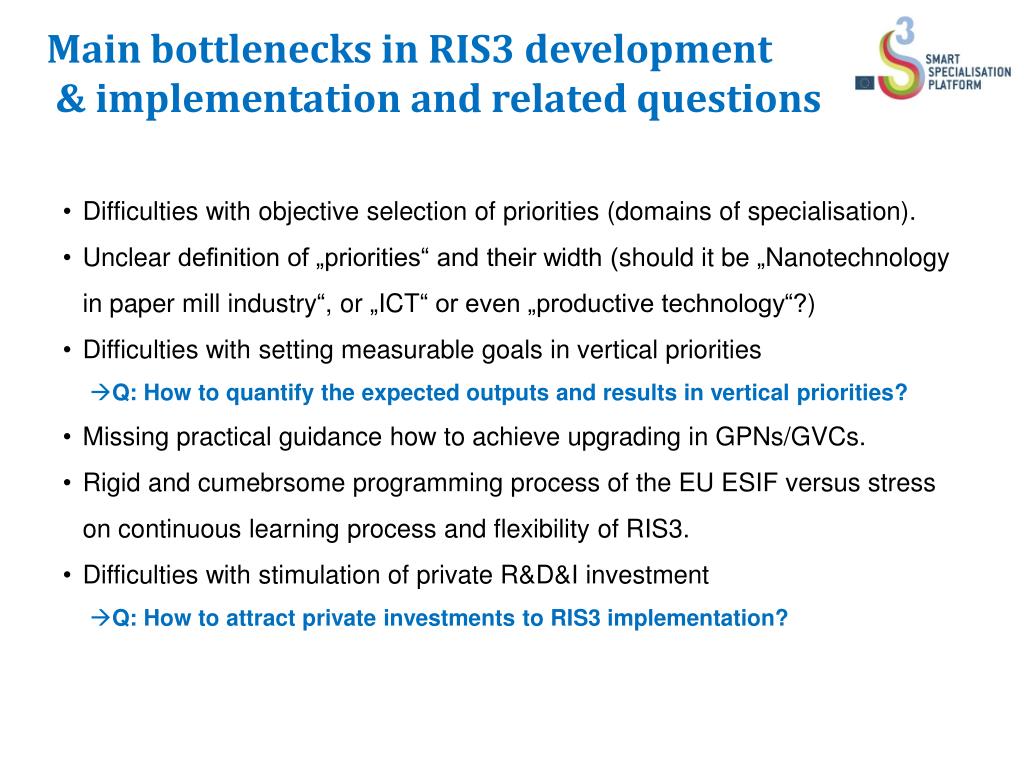 Main bottlenecks in RIS3 development & implementation and related questions • Difficulties with objective selection of priorities (domains of specialisation). • Unclear definition of „priorities“ and their width (should it be „Nanotechnology in paper mill industry“, or „ICT“ or even „productive technology“?) • Difficultieswithsettingmeasurablegoals in verticalpriorities • Q: How to quantify the expected outputs and results in vertical priorities? • Missing practical guidance how to achieve upgrading in GPNs/GVCs. • Rigid and cumebrsomeprogrammingprocessof the EU ESIF versus stress on continuouslearningprocess and flexibility of RIS3. • Difficulties with stimulation of private R&D&I investment • Q: Howto attractprivateinvestments to RIS3 implementation?