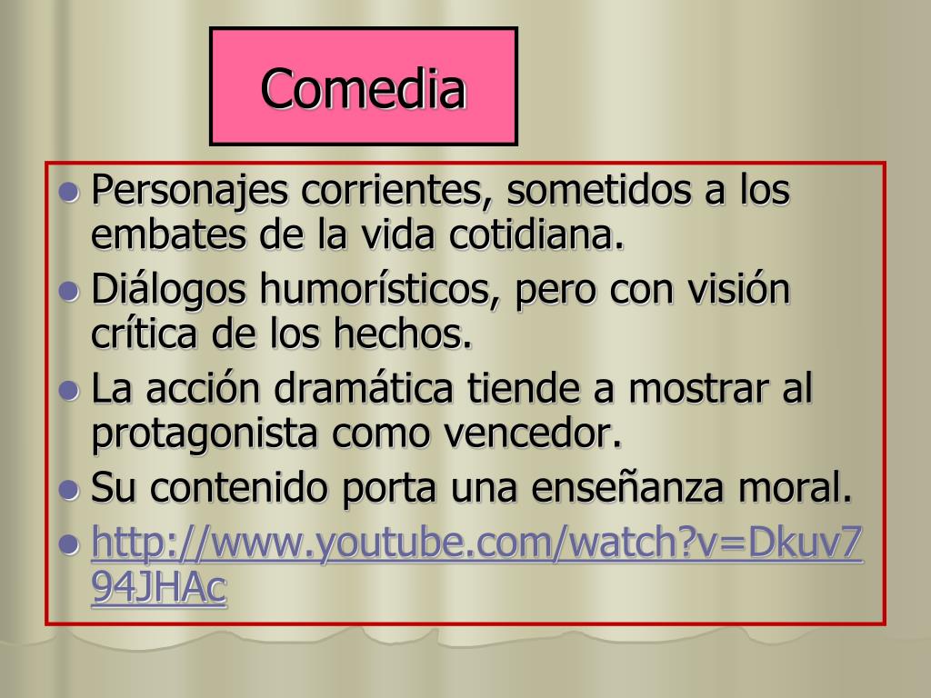 Comedia • Personajes corrientes, sometidos a los embates de la vida cotidiana. • Diálogos humorísticos, pero con visión crítica de los hechos. • La acción dramática tiende a mostrar al protagonista como vencedor. • Su contenido porta una enseñanza moral. • http://www.youtube.com/watch?v=Dkuv794JHAc
