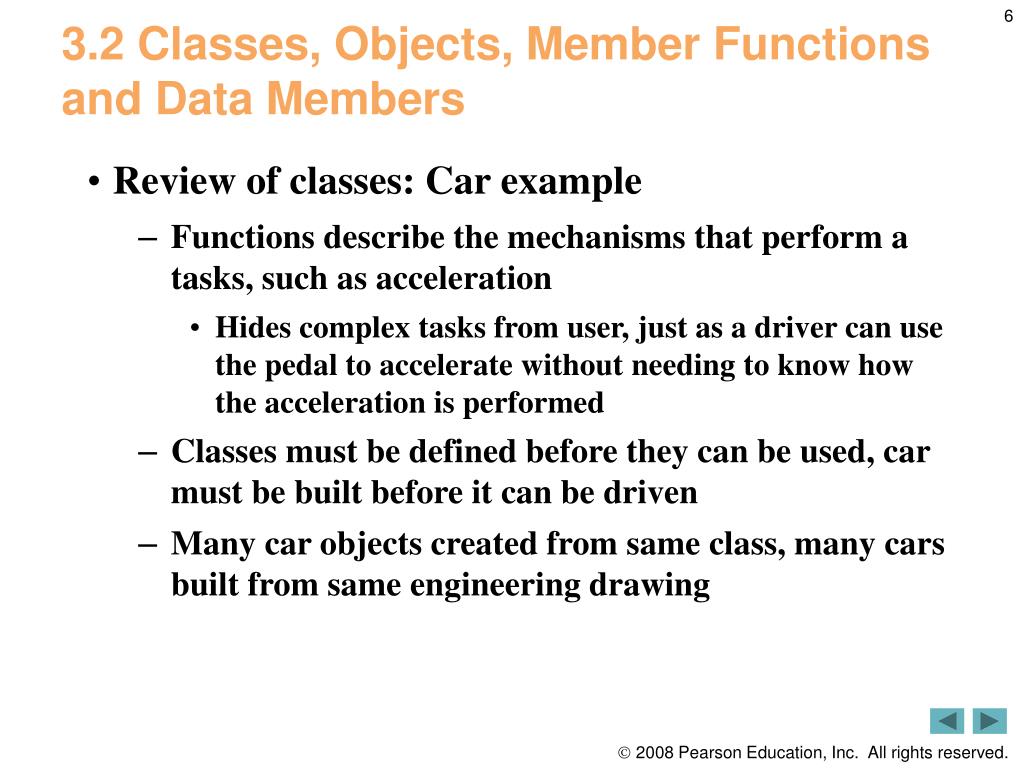 3.2 Classes, Objects, Member Functions and Data Members • Review of classes: Car example • Functions describe the mechanisms that perform a tasks, such as acceleration • Hides complex tasks from user, just as a driver can use the pedal to accelerate without needing to know how the acceleration is performed • Classes must be defined before they can be used, car must be built before it can be driven • Many car objects created from same class, many cars built from same engineering drawing