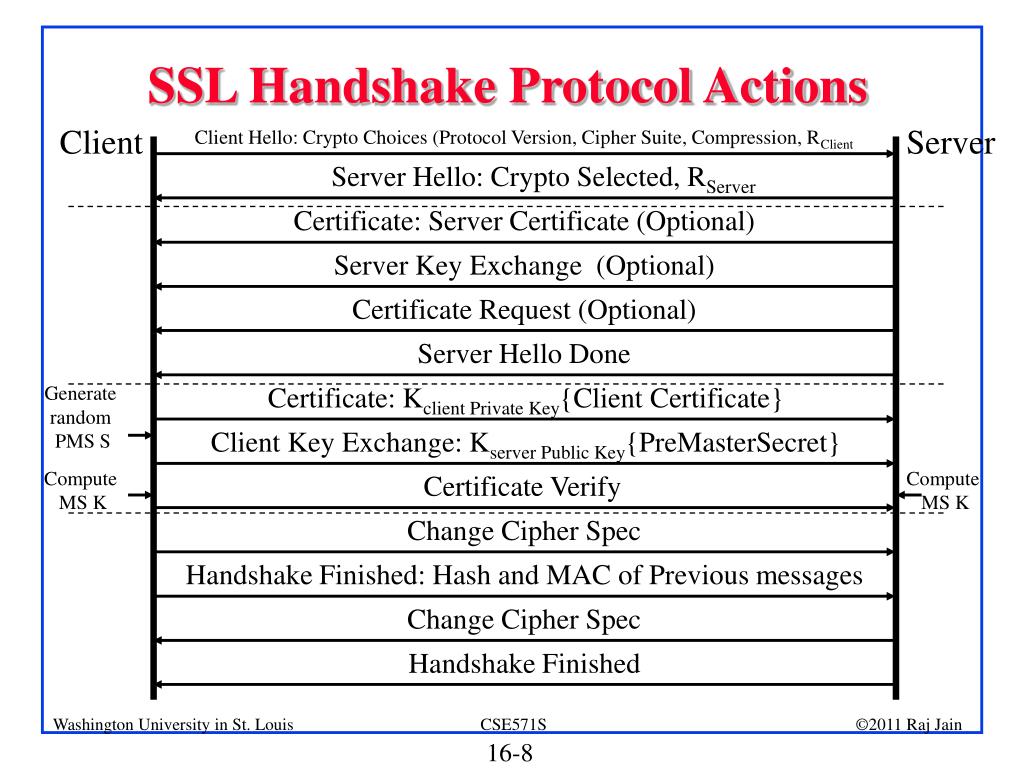 SSL Handshake Protocol Actions Client Server Client Hello: Crypto Choices (Protocol Version, Cipher Suite, Compression, RClient Server Hello: Crypto Selected, RServer Certificate: Server Certificate (Optional) Server Key Exchange (Optional) Certificate Request (Optional) Server Hello Done Certificate: Kclient Private Key{Client Certificate} Generate random PMS S Client Key Exchange: Kserver Public Key{PreMasterSecret} Compute MS K Compute MS K Certificate Verify Change Cipher Spec Handshake Finished: Hash and MAC of Previous messages Change Cipher Spec Handshake Finished