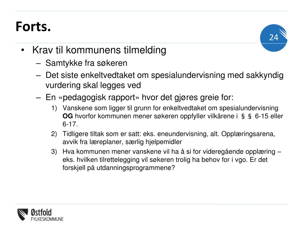 Forts. • Krav til kommunens tilmelding • Samtykke fra søkeren • Det siste enkeltvedtaket om spesialundervisning med sakkyndig vurdering skal legges ved • En «pedagogisk rapport» hvor det gjøres greie for: • Vanskene som ligger til grunn for enkeltvedtaket om spesialundervisning OG hvorfor kommunen mener søkeren oppfyller vilkårene i §§ 6-15 eller 6-17. • Tidligere tiltak som er satt: eks. eneundervisning, alt. Opplæringsarena, avvik fra læreplaner, særlig hjelpemidler • Hva kommunen mener vanskene vil ha å si for videregående opplæring – eks. hvilken tilrettelegging vil søkeren trolig ha behov for i vgo. Er det forskjell på utdanningsprogrammene?