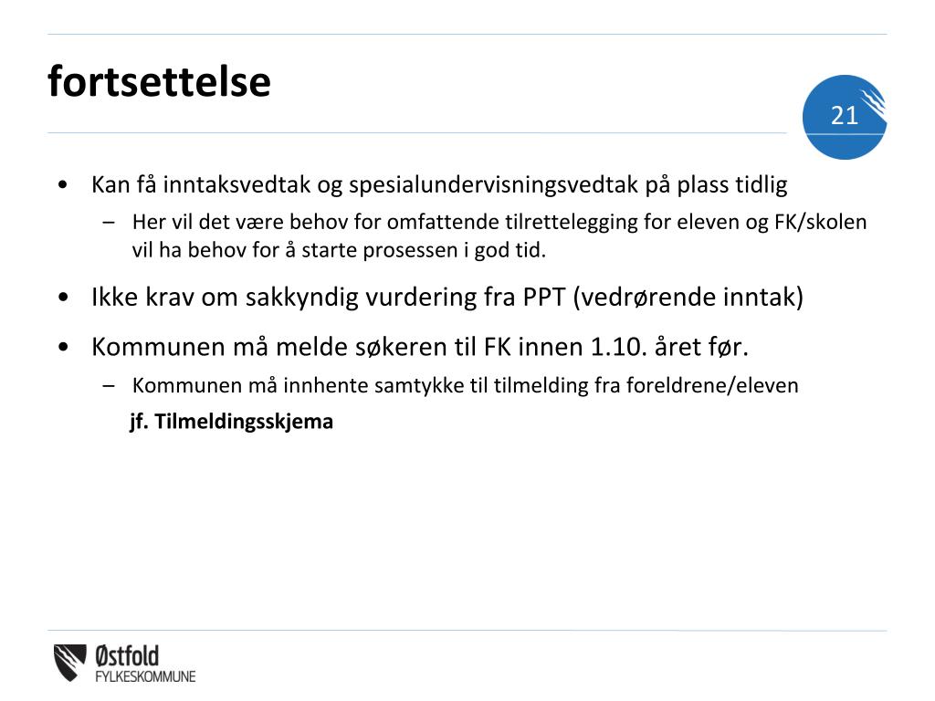 fortsettelse • Kan få inntaksvedtak og spesialundervisningsvedtak på plass tidlig • Her vil det være behov for omfattende tilrettelegging for eleven og FK/skolen vil ha behov for å starte prosessen i god tid. • Ikke krav om sakkyndig vurdering fra PPT (vedrørende inntak) • Kommunen må melde søkeren til FK innen 1.10. året før. • Kommunen må innhente samtykke til tilmelding fra foreldrene/eleven jf. Tilmeldingsskjema