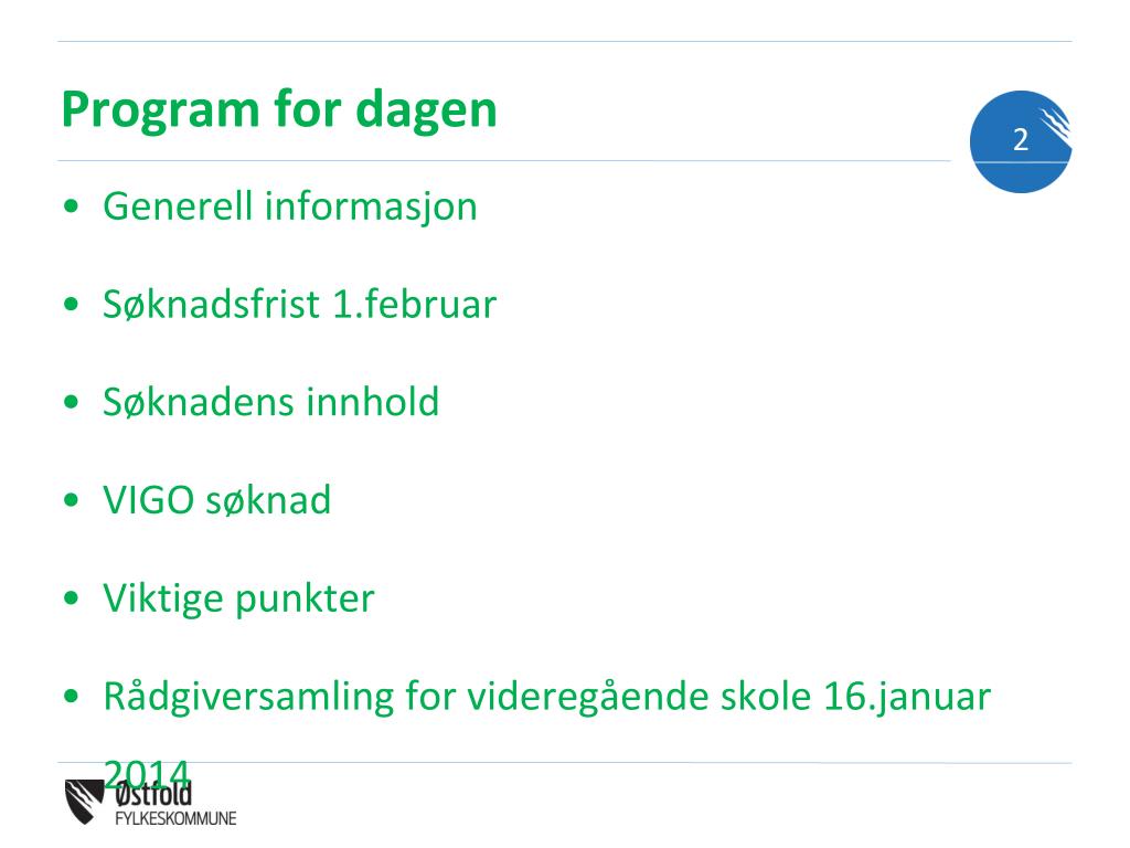 Program for dagen • Generell informasjon • Søknadsfrist 1.februar • Søknadens innhold • VIGO søknad • Viktige punkter • Rådgiversamling for videregående skole 16.januar 2014