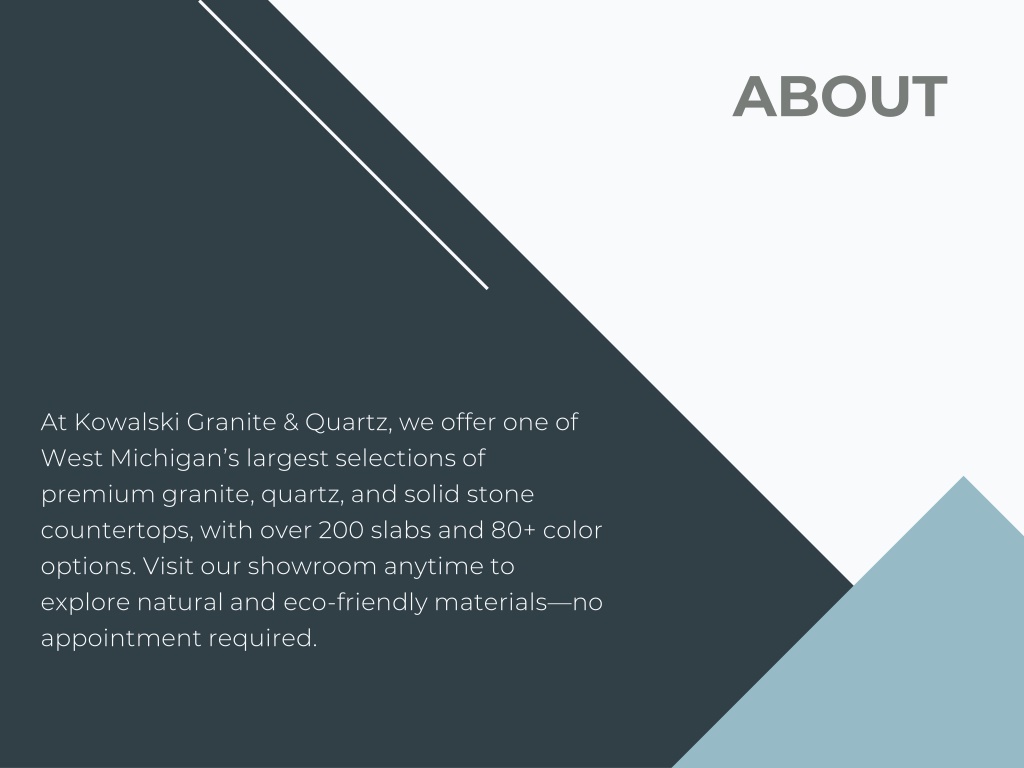 ABOUT At Kowalski Granite & Quartz, we offer one of West Michigan’s largest selections of premium granite, quartz, and solid stone countertops, with over 200 slabs and 80+ color options. Visit our showroom anytime to explore natural and eco-friendly materials—no appointment required.