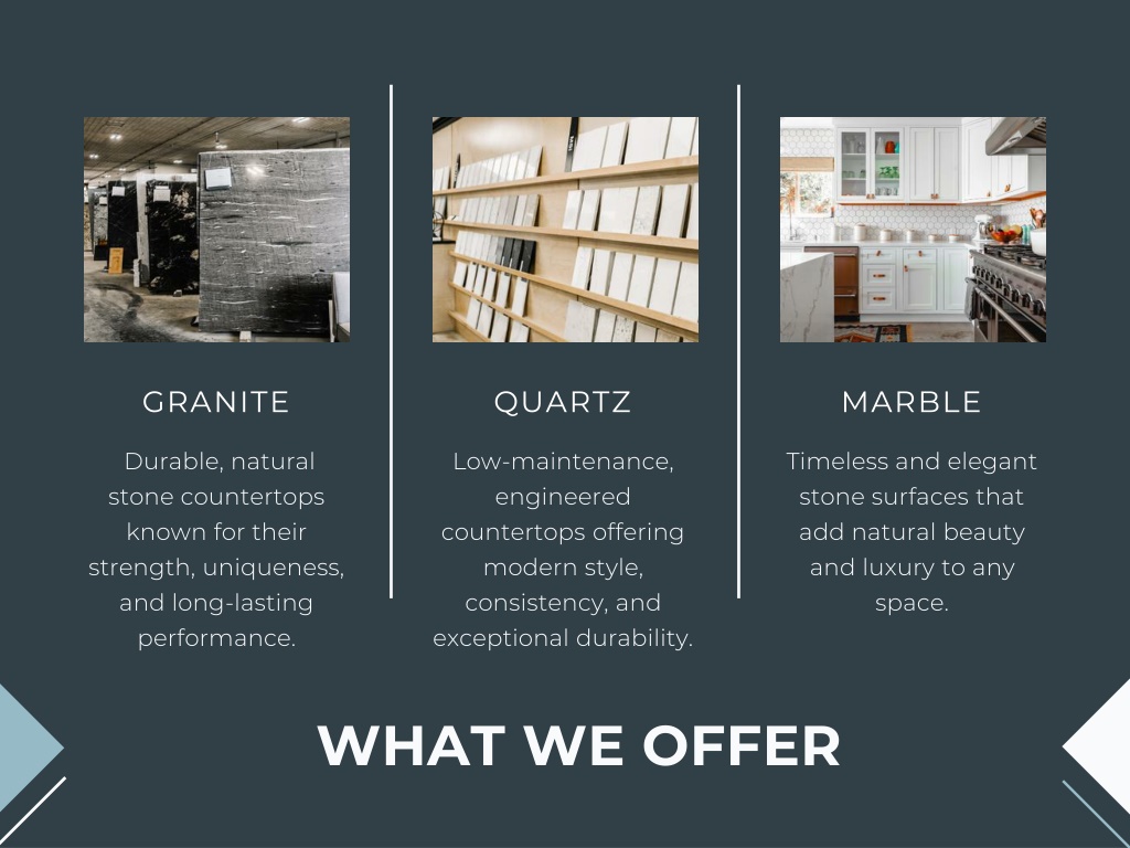 GRANITE QUARTZ MARBLE Durable, natural stone countertops known for their strength, uniqueness, and long-lasting performance. Low-maintenance, engineered countertops offering modern style, consistency, and exceptional durability. Timeless and elegant stone surfaces that add natural beauty and luxury to any space. WHAT WE OFFER