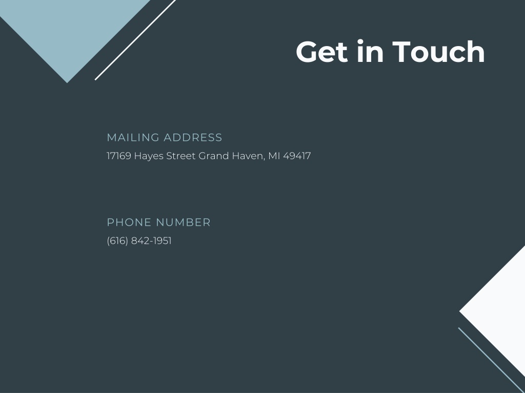 MAILING ADDRESS 17169 Hayes Street Grand Haven, MI 49417 Get in Touch PHONE NUMBER (616) 842-1951