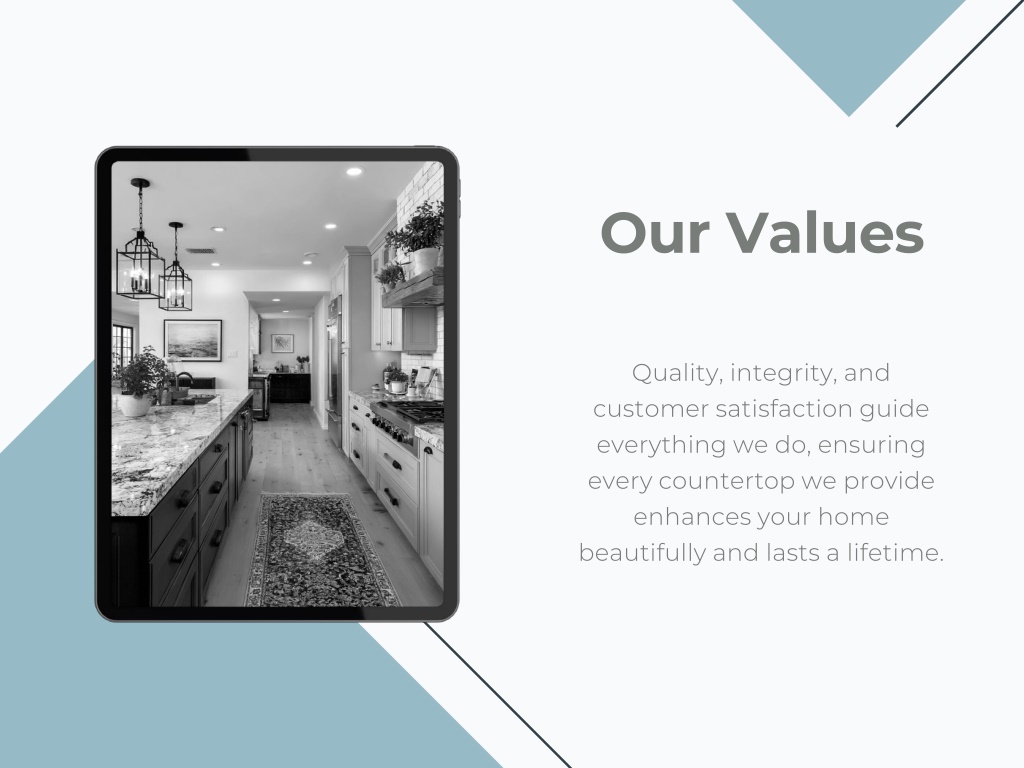 Our Values Quality, integrity, and customer satisfaction guide everything we do, ensuring every countertop we provide enhances your home beautifully and lasts a lifetime.