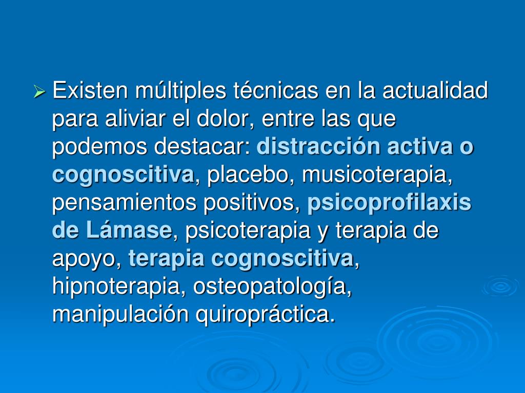 Existen múltiples técnicas en la actualidad para aliviar el dolor, entre las que podemos destacar: distracción activa o cognoscitiva, placebo, musicoterapia, pensamientos positivos, psicoprofilaxis de Lámase, psicoterapia y terapia de apoyo, terapia cognoscitiva, hipnoterapia, osteopatología, manipulación quiropráctica.