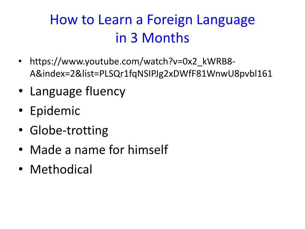 How to Learn a Foreign Language in 3 Months • https://www.youtube.com/watch?v=0x2_kWRB8-A&index=2&list=PLSQr1fqNSIPJg2xDWfF81WnwU8pvbl161 • Language fluency • Epidemic • Globe-trotting • Made a name for himself • Methodical