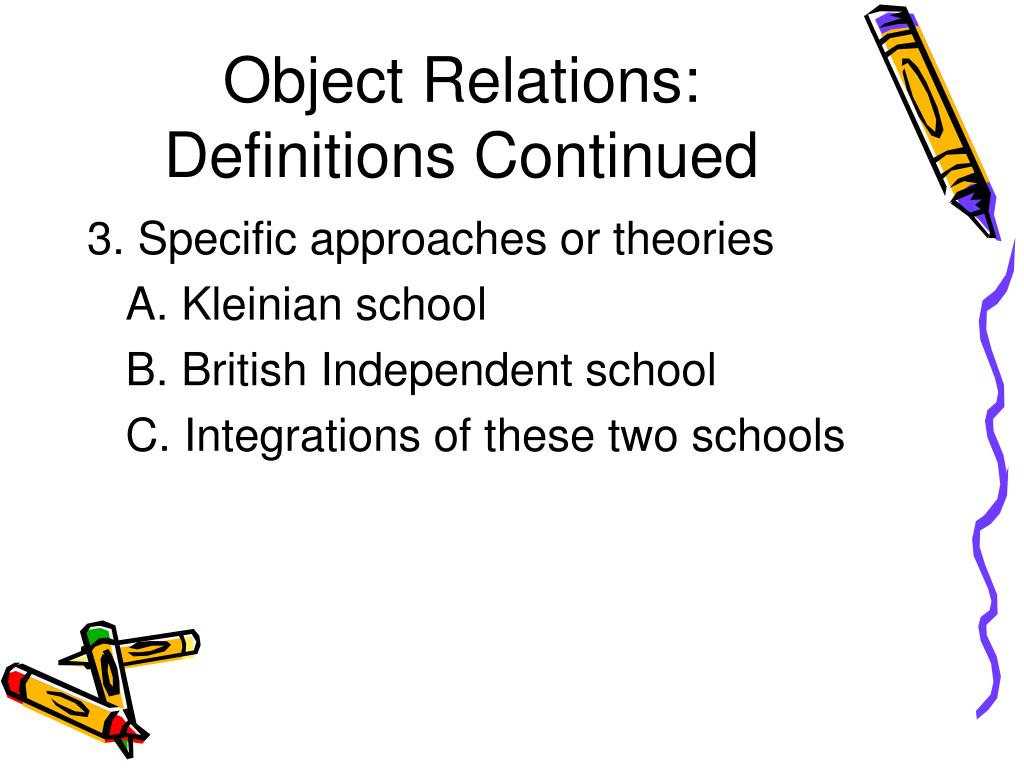 Object Relations: Definitions Continued 3. Specific approaches or theories A. Kleinian school B. British Independent school C. Integrations of these two schools