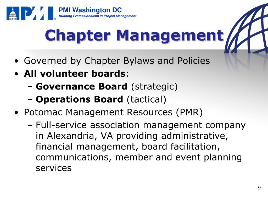 Chapter Management • Governed by Chapter Bylaws and Policies • All volunteer boards: • Governance Board (strategic) • Operations Board (tactical) • Potomac Management Resources (PMR) • Full-service association management company in Alexandria, VA providing administrative, financial management, board facilitation, communications, member and event planning services