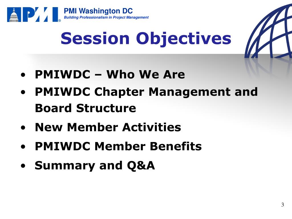 Session Objectives PMIWDC – Who We Are PMIWDC Chapter Management and Board Structure New Member Activities PMIWDC Member Benefits Summary and Q&A