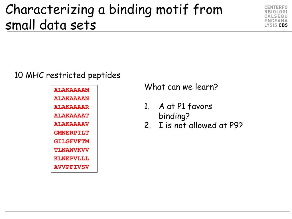 Characterizing a binding motif from small data sets 10 MHC restricted peptides • What can we learn? • A at P1 favors binding? • I is not allowed at P9? ALAKAAAAM ALAKAAAAN ALAKAAAAR ALAKAAAAT ALAKAAAAV GMNERPILT GILGFVFTM TLNAWVKVV KLNEPVLLL AVVPFIVSV