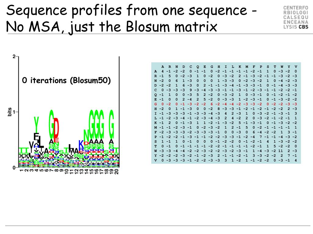 Sequence profiles from one sequence - No MSA, just the Blosum matrix A R N D C Q E G H I L K M F P S T W Y V A 4 -1 -2 -2 0 -1 -1 0 -2 -1 -1 -1 -1 -2 -1 1 0 -3 -2 0 R -1 5 0 -2 -3 1 0 -2 0 -3 -2 2 -1 -3 -2 -1 -1 -3 -2 -3 N -2 0 6 1 -3 0 0 0 1 -3 -3 0 -2 -3 -2 1 0 -4 -2 -3 D -2 -2 1 6 -3 0 2 -1 -1 -3 -4 -1 -3 -3 -1 0 -1 -4 -3 -3 C 0 -3 -3 -3 9 -3 -4 -3 -3 -1 -1 -3 -1 -2 -3 -1 -1 -2 -2 -1 Q -1 1 0 0 -3 5 2 -2 0 -3 -2 1 0 -3 -1 0 -1 -2 -1 -2 E -1 0 0 2 -4 2 5 -2 0 -3 -3 1 -2 -3 -1 0 -1 -3 -2 -2 G 0 -2 0 -1 -3 -2 -2 6 -2 -4 -4 -2 -3 -3 -2 0 -2 -2 -3 -3 H -2 0 1 -1 -3 0 0 -2 8 -3 -3 -1 -2 -1 -2 -1 -2 -2 2 -3 I -1 -3 -3 -3 -1 -3 -3 -4 -3 4 2 -3 1 0 -3 -2 -1 -3 -1 3 L -1 -2 -3 -4 -1 -2 -3 -4 -3 2 4 -2 2 0 -3 -2 -1 -2 -1 1 K -1 2 0 -1 -3 1 1 -2 -1 -3 -2 5 -1 -3 -1 0 -1 -3 -2 -2 M -1 -1 -2 -3 -1 0 -2 -3 -2 1 2 -1 5 0 -2 -1 -1 -1 -1 1 F -2 -3 -3 -3 -2 -3 -3 -3 -1 0 0 -3 0 6 -4 -2 -2 1 3 -1 P -1 -2 -2 -1 -3 -1 -1 -2 -2 -3 -3 -1 -2 -4 7 -1 -1 -4 -3 -2 S 1 -1 1 0 -1 0 0 0 -1 -2 -2 0 -1 -2 -1 4 1 -3 -2 -2 T 0 -1 0 -1 -1 -1 -1 -2 -2 -1 -1 -1 -1 -2 -1 1 5 -2 -2 0 W -3 -3 -4 -4 -2 -2 -3 -2 -2 -3 -2 -3 -1 1 -4 -3 -2 11 2 -3 Y -2 -2 -2 -3 -2 -1 -2 -3 2 -1 -1 -2 -1 3 -3 -2 -2 2 7 -1 V 0 -3 -3 -3 -1 -2 -2 -3 -3 3 1 -2 1 -1 -2 -2 0 -3 -1 4 0 iterations (Blosum50)