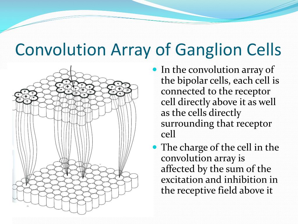 Convolution Array of Ganglion Cells • In the convolution array of the bipolar cells, each cell is connected to the receptor cell directly above it as well as the cells directly surrounding that receptor cell • The charge of the cell in the convolution array is affected by the sum of the excitation and inhibition in the receptive field above it