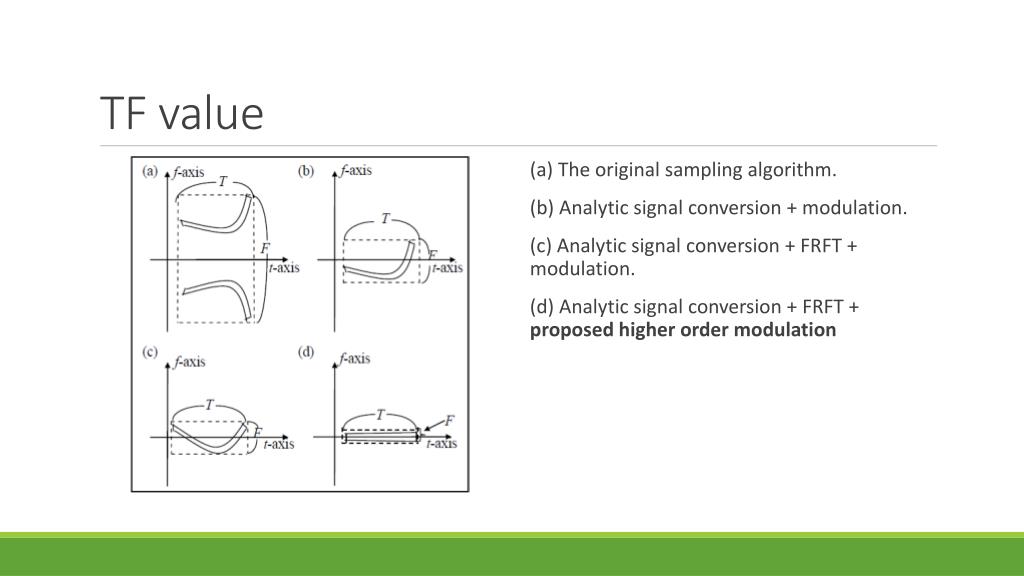 TF value • (a) The original sampling algorithm. • (b) Analytic signal conversion + modulation. • (c) Analytic signal conversion + FRFT + modulation. • (d) Analytic signal conversion + FRFT + proposed higher order modulation