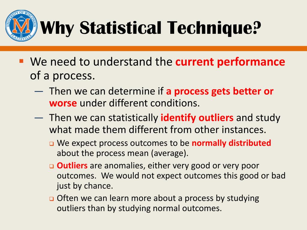 Why Statistical Technique? • We need to understand the current performanceof a process. • Then we can determine if a process gets better or worse under different conditions. • Then we can statistically identify outliersand study what made them different from other instances. • We expect process outcomes to be normally distributed about the process mean (average). • Outliers are anomalies, either very good or very poor outcomes. We would not expect outcomes this good or bad just by chance. • Often we can learn more about a process by studying outliers than by studying normal outcomes.