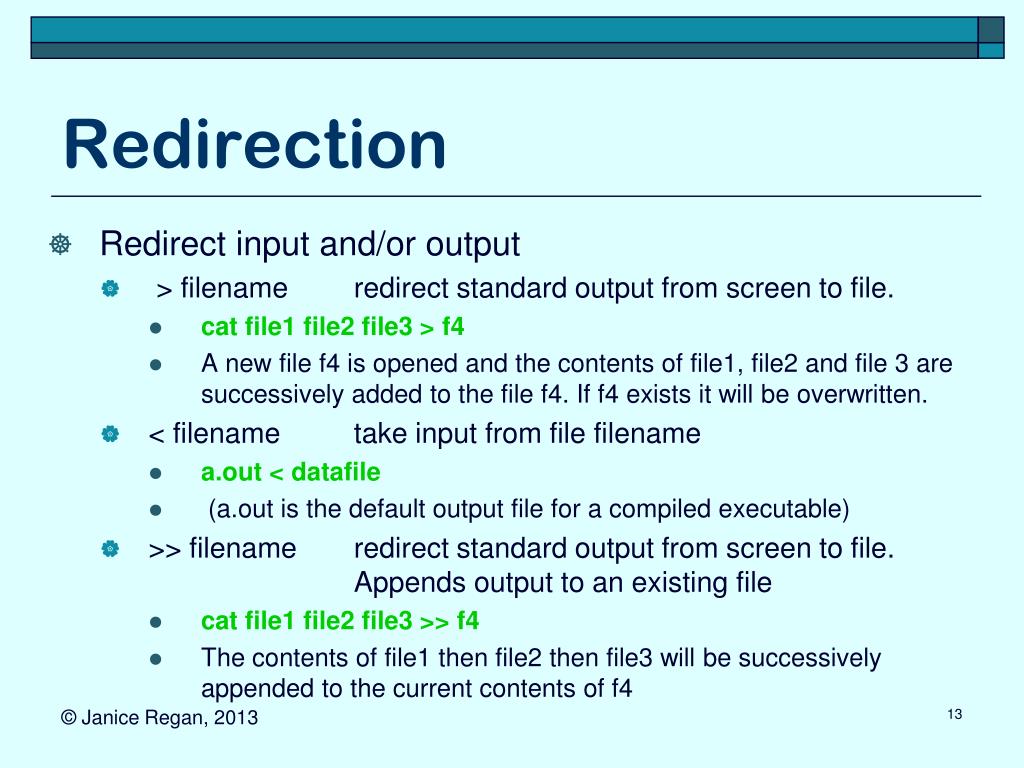 Redirection • Redirect input and/or output • > filename redirect standard output from screen to file. • cat file1 file2 file3 > f4 • A new file f4 is opened and the contents of file1, file2 and file 3 are successively added to the file f4. If f4 exists it will be overwritten. • < filename take input from file filename • a.out < datafile • (a.out is the default output file for a compiled executable) • >> filename redirect standard output from screen to file. Appends output to an existing file • cat file1 file2 file3 >> f4 • The contents of file1 then file2 then file3 will be successively appended to the current contents of f4