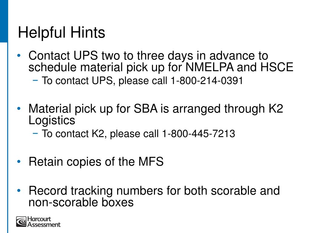 Helpful Hints • Contact UPS two to three days in advance to schedule material pick up for NMELPA and HSCE • To contact UPS, please call 1-800-214-0391 • Material pick up for SBA is arranged through K2 Logistics • To contact K2, please call 1-800-445-7213 • Retain copies of the MFS • Record tracking numbers for both scorable and non-scorable boxes