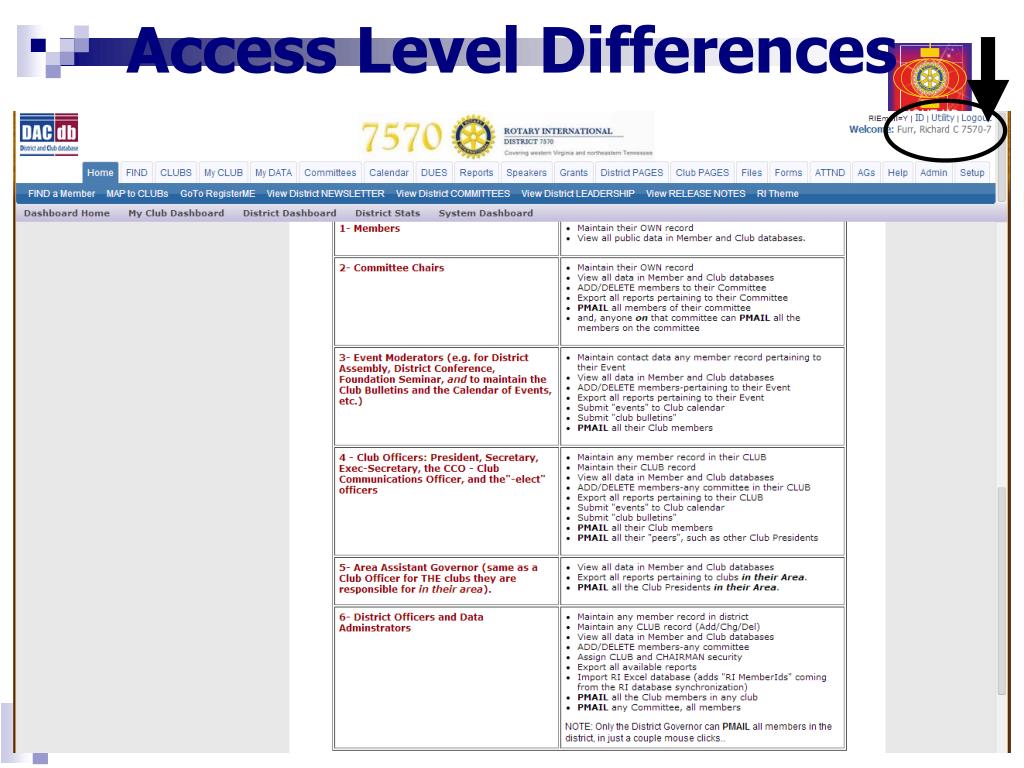 4 Main Sites Rotary International = Club Central District Web Site = Files and News ROTARY.ORG ROTARY7570.ORG District Database – DaCdb = Member Data District Facebook Page = FUN DIRECTORY-ONLINE.COM/ROTARY FACEBOOK.COM/PAGES/ROTARY-DISTRICT-7570/198646316827581