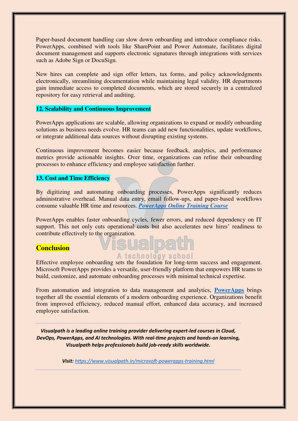 Paper-based document handling can slow down onboarding and introduce compliance risks. PowerApps, combined with tools like SharePoint and Power Automate, facilitates digital document management and supports electronic signatures through integrations with services such as Adobe Sign or DocuSign. New hires can complete and sign offer letters, tax forms, and policy acknowledgments electronically, streamlining documentation while maintaining legal validity. HR departments gain immediate access to completed documents, which are stored securely in a centralized repository for easy retrieval and auditing. 12. Scalability and Continuous Improvement PowerApps applications are scalable, allowing organizations to expand or modify onboarding solutions as business needs evolve. HR teams can add new functionalities, update workflows, or integrate additional data sources without disrupting existing systems. Continuous improvement becomes easier because feedback, analytics, and performance metrics provide actionable insights. Over time, organizations can refine their onboarding processes to enhance efficiency and employee satisfaction further. 13. Cost and Time Efficiency By digitizing and automating onboarding processes, PowerApps significantly reduces administrative overhead. Manual data entry, email follow-ups, and paper-based workflows consume valuable HR time and resources. PowerApps Online Training Course PowerApps enables faster onboarding cycles, fewer errors, and reduced dependency on IT support. This not only cuts operational costs but also accelerates new hires’ readiness to contribute effectively to the organization. Conclusion Effective employee onboarding sets the foundation for long-term success and engagement. Microsoft PowerApps provides a versatile, user-friendly platform that empowers HR teams to build, customize, and automate onboarding processes with minimal technical expertise. From automation and integration to data management and analytics, PowerApps brings together all the essential elements of a modern onboarding experience. Organizations benefit from improved efficiency, reduced manual effort, enhanced data accuracy, and increased employee satisfaction. Visualpath is a leading online training provider delivering expert-led courses in Cloud, DevOps, PowerApps, and AI technologies. With real-time projects and hands-on learning, Visualpath helps professionals build job-ready skills worldwide. Visit: https://www.visualpath.in/microsoft-powerapps-training.html
