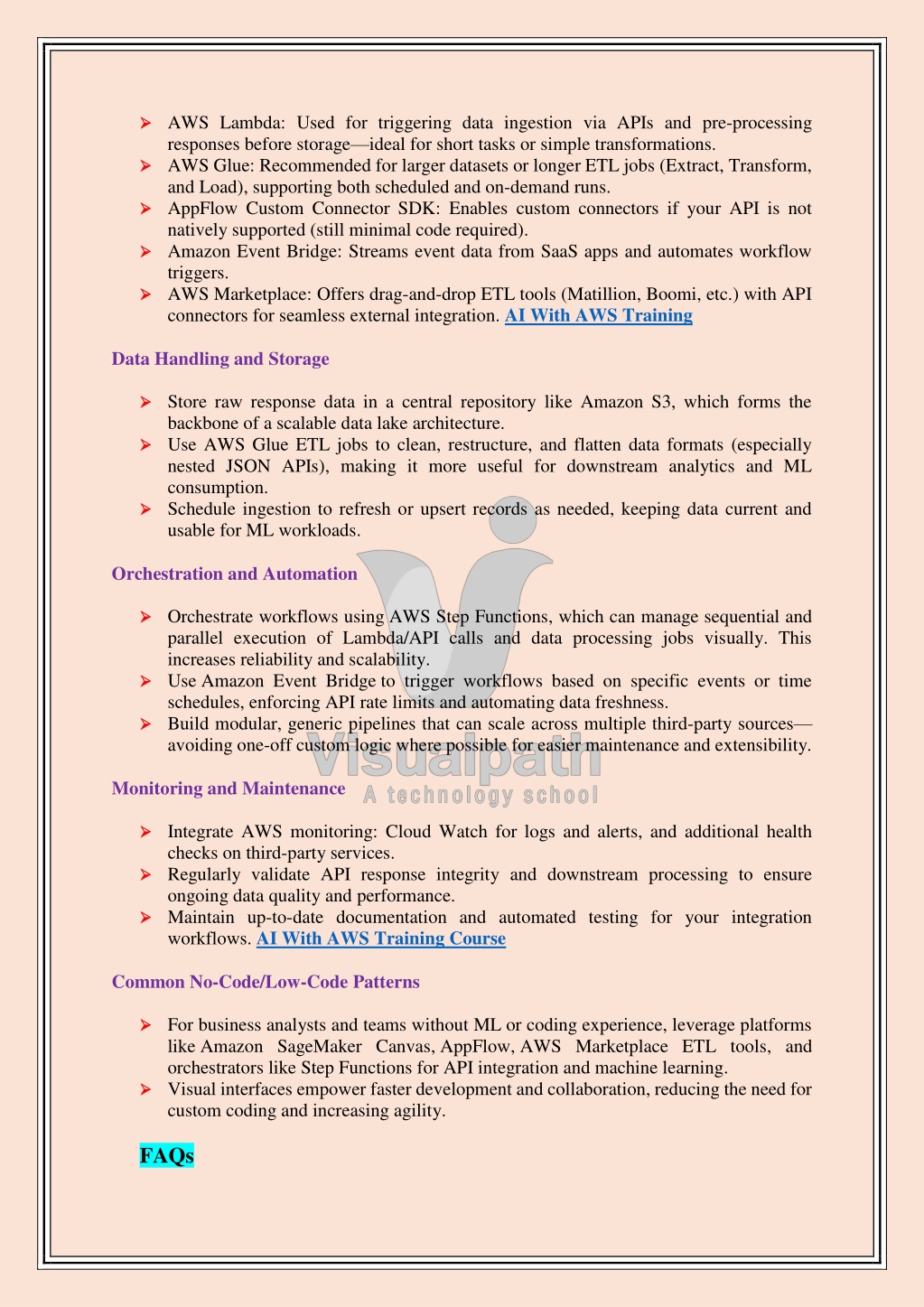 AWS Lambda: Used for triggering data ingestion via APIs and pre-processing responses before storage—ideal for short tasks or simple transformations. AWS Glue: Recommended for larger datasets or longer ETL jobs (Extract, Transform, and Load), supporting both scheduled and on-demand runs. AppFlow Custom Connector SDK: Enables custom connectors if your API is not natively supported (still minimal code required). Amazon Event Bridge: Streams event data from SaaS apps and automates workflow triggers. AWS Marketplace: Offers drag-and-drop ETL tools (Matillion, Boomi, etc.) with API connectors for seamless external integration. AI With AWS Training Data Handling and Storage Store raw response data in a central repository like Amazon S3, which forms the backbone of a scalable data lake architecture. Use AWS Glue ETL jobs to clean, restructure, and flatten data formats (especially nested JSON APIs), making it more useful for downstream analytics and ML consumption. Schedule ingestion to refresh or upsert records as needed, keeping data current and usable for ML workloads. Orchestration and Automation Orchestrate workflows using AWS Step Functions, which can manage sequential and parallel execution of Lambda/API calls and data processing jobs visually. This increases reliability and scalability. Use Amazon Event Bridge to trigger workflows based on specific events or time schedules, enforcing API rate limits and automating data freshness. Build modular, generic pipelines that can scale across multiple third-party sources— avoiding one-off custom logic where possible for easier maintenance and extensibility. Monitoring and Maintenance Integrate AWS monitoring: Cloud Watch for logs and alerts, and additional health checks on third-party services. Regularly validate API response integrity and downstream processing to ensure ongoing data quality and performance. Maintain up-to-date documentation and automated testing for your integration workflows. AI With AWS Training Course Common No-Code/Low-Code Patterns For business analysts and teams without ML or coding experience, leverage platforms like Amazon SageMaker Canvas, AppFlow, AWS Marketplace ETL tools, and orchestrators like Step Functions for API integration and machine learning. Visual interfaces empower faster development and collaboration, reducing the need for custom coding and increasing agility. FAQs