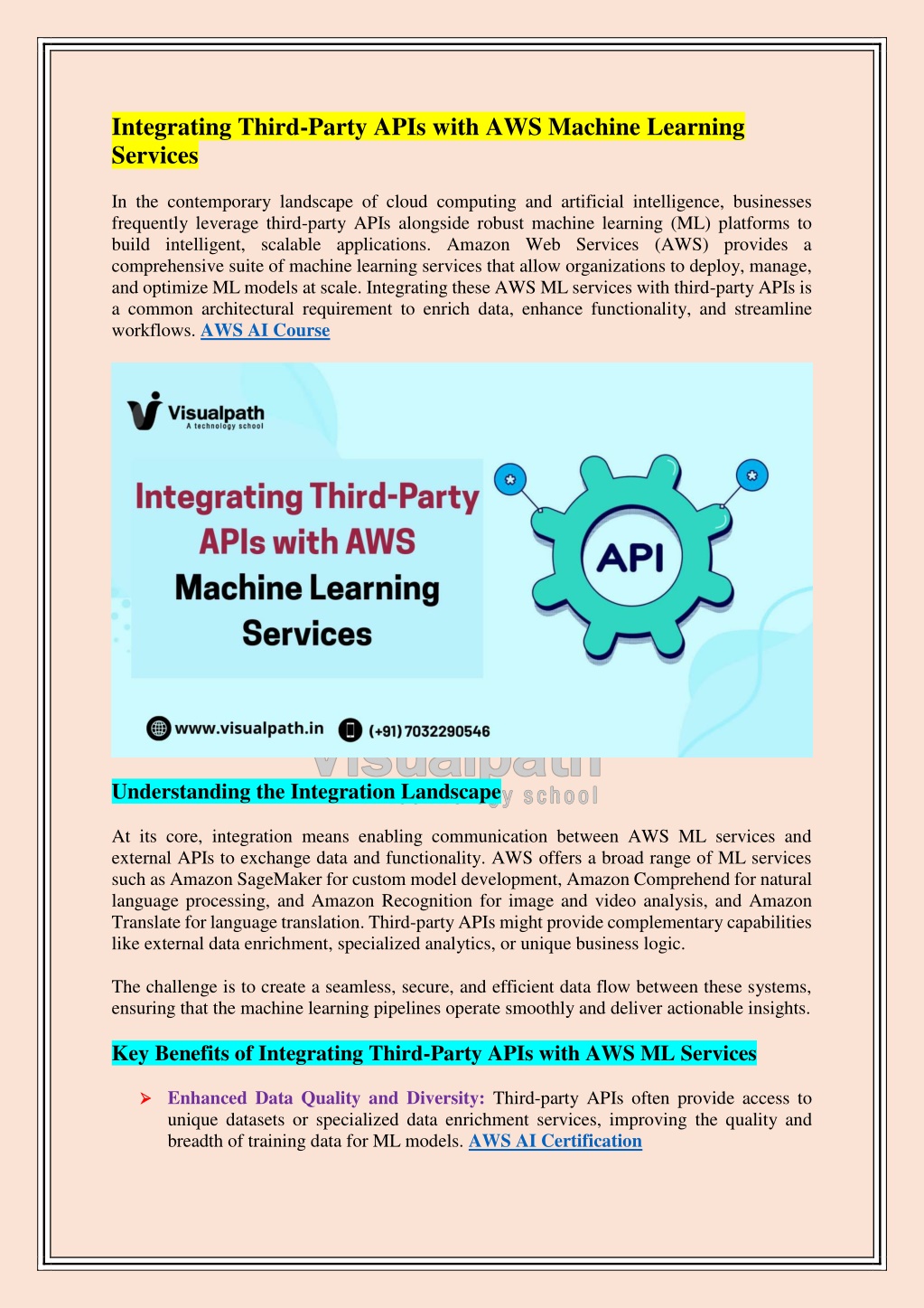 1.What are the key benefits of integrating third-party APIs with AWS ML services? To enhance data quality, extend functionality, and streamline ML workflows. 2.How do I ensure security when connecting third-party APIs to AWS ML? By using encrypted communication, secure credential storage, and strict access controls. 3.Can AWS handle real-time API calls for ML model inference? Yes, using services like AWS Lambda and API Gateway for low-latency processing. 4.What is the best approach for handling API failures during integration? Implement retry mechanisms, fallbacks, and idempotent requests to ensure reliability. 5.How do I manage costs when integrating third-party APIs with AWS ML? By monitoring usage, optimizing data transfer, and choosing appropriate batch or real-time processing. Conclusion Integrating third-party APIs with AWS machine learning services offers powerful opportunities to augment model capabilities and deliver business value. Success hinges on clear use case definition, robust architectural design, security compliance, and operational excellence in monitoring and error handling. AWS AI Online Training By strategically leveraging AWS managed services and following best practices, organizations can build flexible, scalable, and maintainable integrations that unlock the full potential of their ML initiatives. As cloud ecosystems evolve, mastering these integrations becomes essential for driving innovation and competitive advantage. Visualpath is a leading online training provider offering expert- led courses in Cloud, DevOps, and AI with hands-on learning and real-time projects. We deliver worldwide training with 100% placement assistance to help professionals boost their careers in emerging technologies. Contact Call/WhatsApp: +91-7032290546 Visit: https://www.visualpath.in/aws-ai-online-training.html