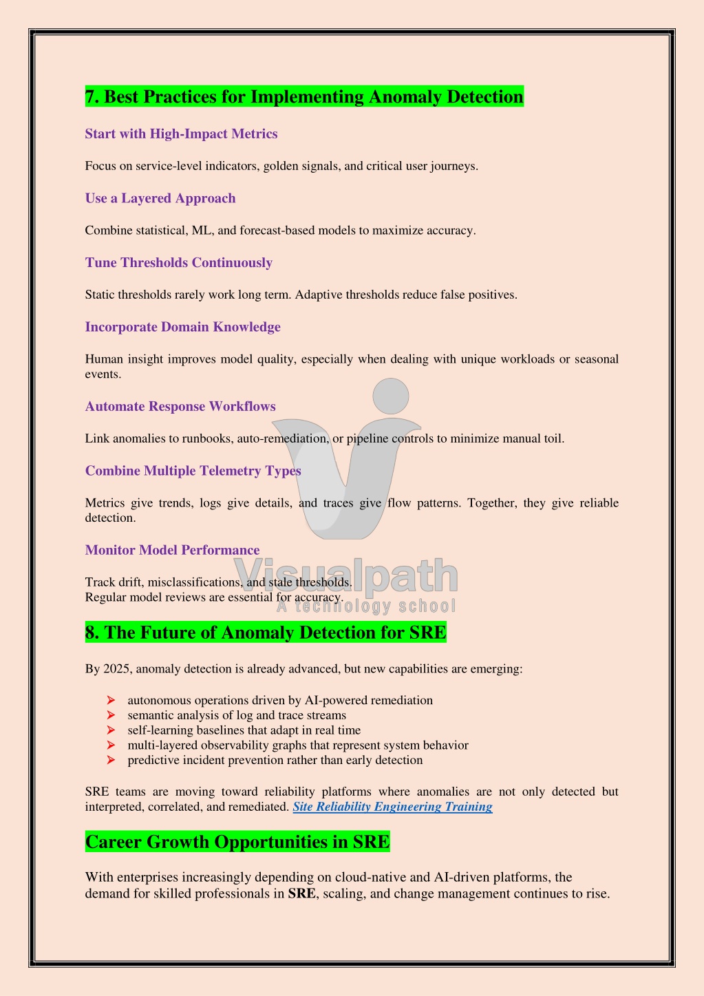 6. 7. Best Practices for Implementing Anomaly Detection Start with High-Impact Metrics Focus on service-level indicators, golden signals, and critical user journeys. Use a Layered Approach Combine statistical, ML, and forecast-based models to maximize accuracy. Tune Thresholds Continuously Static thresholds rarely work long term. Adaptive thresholds reduce false positives. Incorporate Domain Knowledge Human insight improves model quality, especially when dealing with unique workloads or seasonal events. Automate Response Workflows Link anomalies to runbooks, auto-remediation, or pipeline controls to minimize manual toil. Combine Multiple Telemetry Types Metrics give trends, logs give details, and traces give flow patterns. Together, they give reliable detection. Monitor Model Performance Track drift, misclassifications, and stale thresholds. Regular model reviews are essential for accuracy. 8. The Future of Anomaly Detection for SRE By 2025, anomaly detection is already advanced, but new capabilities are emerging:  autonomous operations driven by AI-powered remediation  semantic analysis of log and trace streams  self-learning baselines that adapt in real time  multi-layered observability graphs that represent system behavior  predictive incident prevention rather than early detection SRE teams are moving toward reliability platforms where anomalies are not only detected but interpreted, correlated, and remediated. Site Reliability Engineering Training Career Growth Opportunities in SRE With enterprises increasingly depending on cloud-native and AI-driven platforms, the demand for skilled professionals in SRE, scaling, and change management continues to rise.