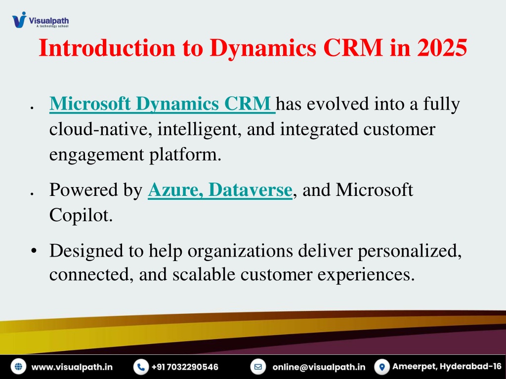 Take your CRM career further with Visualpathu2019s Dynamics CRM Online Training. Learn automation and analytics in sales, marketing, and service. Get trained by certified professionals with hands-on learning. Real-time projects ensure practical understanding and job readiness. Enroll today by calling 91-7032290546 for your free demo.<br>Visit: https://www.visualpath.in/online-microsoft-dynamics-crm.html<br>WhatsApp: https://wa.me/c/917032290546<br>Visit Our Blog: https://visualpathblogs.com/category/microsoft-dynamics-crm-with-powerapps/
