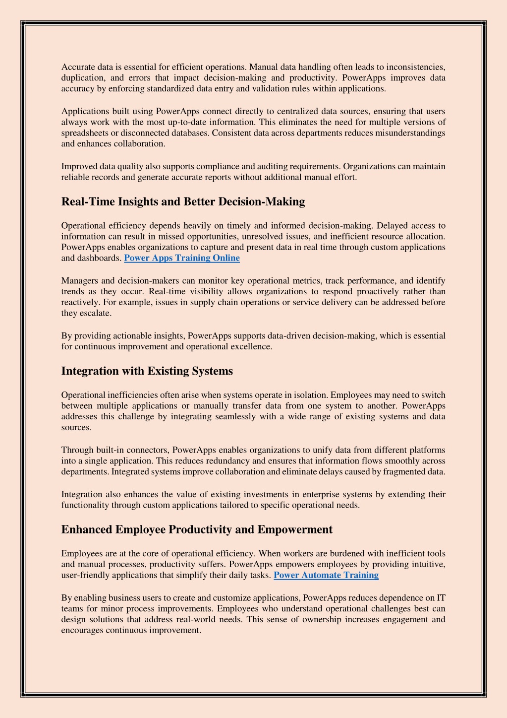 Accurate data is essential for efficient operations. Manual data handling often leads to inconsistencies, duplication, and errors that impact decision-making and productivity. PowerApps improves data accuracy by enforcing standardized data entry and validation rules within applications. Applications built using PowerApps connect directly to centralized data sources, ensuring that users always work with the most up-to-date information. This eliminates the need for multiple versions of spreadsheets or disconnected databases. Consistent data across departments reduces misunderstandings and enhances collaboration. Improved data quality also supports compliance and auditing requirements. Organizations can maintain reliable records and generate accurate reports without additional manual effort. Real-Time Insights and Better Decision-Making Operational efficiency depends heavily on timely and informed decision-making. Delayed access to information can result in missed opportunities, unresolved issues, and inefficient resource allocation. PowerApps enables organizations to capture and present data in real time through custom applications and dashboards. Power Apps Training Online Managers and decision-makers can monitor key operational metrics, track performance, and identify trends as they occur. Real-time visibility allows organizations to respond proactively rather than reactively. For example, issues in supply chain operations or service delivery can be addressed before they escalate. By providing actionable insights, PowerApps supports data-driven decision-making, which is essential for continuous improvement and operational excellence. Integration with Existing Systems Operational inefficiencies often arise when systems operate in isolation. Employees may need to switch between multiple applications or manually transfer data from one system to another. PowerApps addresses this challenge by integrating seamlessly with a wide range of existing systems and data sources. Through built-in connectors, PowerApps enables organizations to unify data from different platforms into a single application. This reduces redundancy and ensures that information flows smoothly across departments. Integrated systems improve collaboration and eliminate delays caused by fragmented data. Integration also enhances the value of existing investments in enterprise systems by extending their functionality through custom applications tailored to specific operational needs. Enhanced Employee Productivity and Empowerment Employees are at the core of operational efficiency. When workers are burdened with inefficient tools and manual processes, productivity suffers. PowerApps empowers employees by providing intuitive, user-friendly applications that simplify their daily tasks. Power Automate Training By enabling business users to create and customize applications, PowerApps reduces dependence on IT teams for minor process improvements. Employees who understand operational challenges best can design solutions that address real-world needs. This sense of ownership increases engagement and encourages continuous improvement.