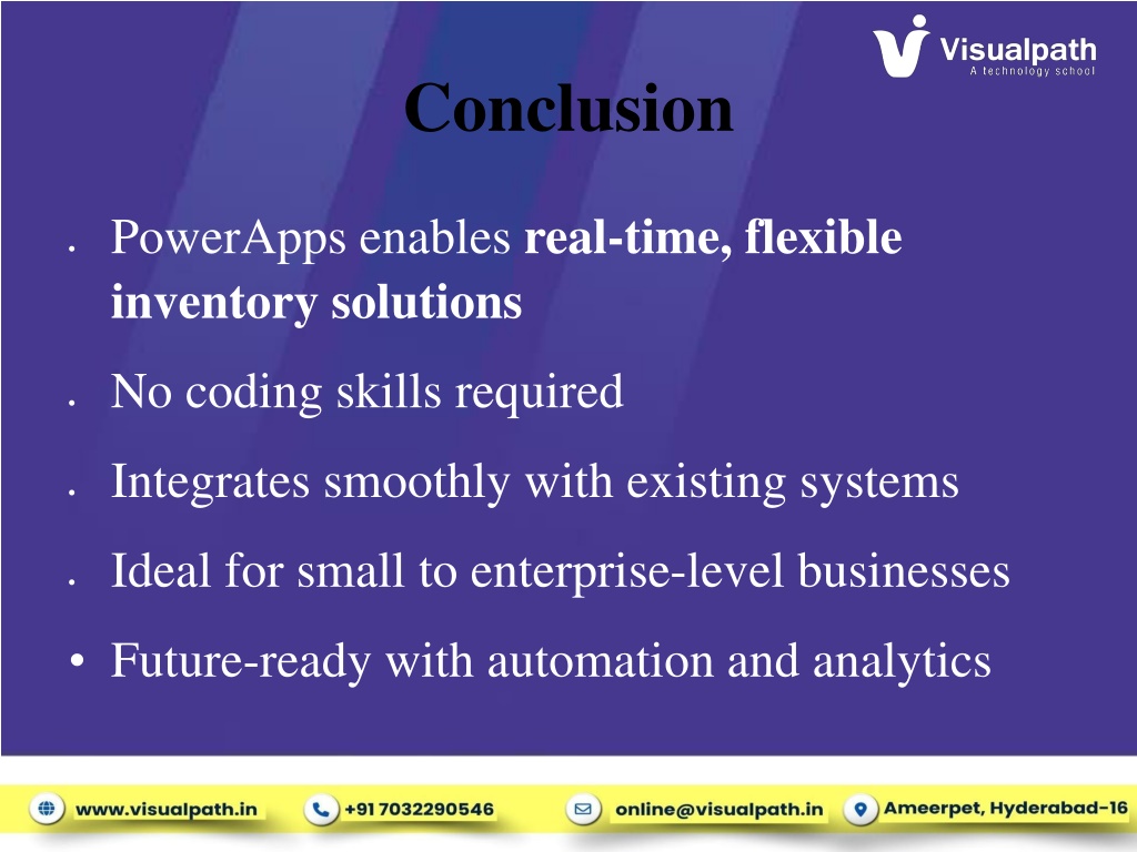 Conclusion • PowerApps enables real-time, flexible inventory solutions • No coding skills required • Integrates smoothly with existing systems • Ideal for small to enterprise-level businesses • Future-ready with automation and analytics
