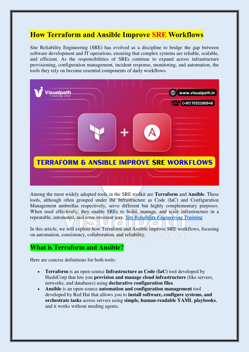 In a GitOps pipeline: Terraform can be used to automatically provision infrastructure when pull requests are merged Ansible can be used to configure services and environments post-deployment All changes are tracked in Git, enabling safe rollbacks, audits, and collaborative workflows This convergence creates a self-service model, where developers can trigger infrastructure or environment changes through code, with governance and controls implemented by SREs. FAQs Terraform and Ansible improve SRE workflows: 1.What is the main difference between Terraform and Ansible in SRE workflows? Terraform provisions infrastructure, while Ansible configures and manages it. 2.Can Terraform and Ansible be used together in the same workflow? Yes, they complement each other by handling different parts of the infrastructure lifecycle. 3.How do these tools help reduce downtime and manual errors? They automate infrastructure and configuration, ensuring consistency and quick recovery. 4.Are Terraform and Ansible suitable for multi-cloud environments? Yes, both support multiple platforms and providers, making them ideal for hybrid or multi-cloud setups. 5.Do Terraform and Ansible support version control and collaboration? Yes, both integrate well with Git, enabling team collaboration and auditability of changes. Conclusion The combination of Terraform and Ansible significantly enhances SRE workflows by introducing automation, consistency, repeatability, and control into complex infrastructure and operations tasks. While Terraform focuses on the provisioning of infrastructure, Ansible complements it by managing the configuration and deployment of services. Together, they empower SRE teams to build scalable, reliable, and maintainable systems. They reduce toil, prevent drift, support rapid incident response, and align infrastructure management with modern DevOps practices. Visualpath is a leading online training platform offering expert-led courses in SRE, Cloud, DevOps, AI, and more. Gain hands-on skills with 100% placement support. Contact Call/WhatsApp: +91-7032290546 Visit: https://www.visualpath.in/online-site-reliability-engineering-training.html
