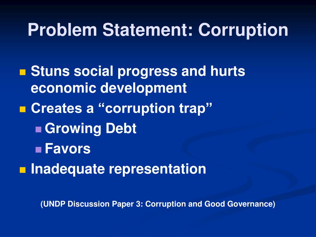 Problem Statement: Corruption • Stuns social progress and hurts economic development • Creates a “corruption trap” • Growing Debt • Favors • Inadequate representation (UNDP Discussion Paper 3: Corruption and Good Governance)