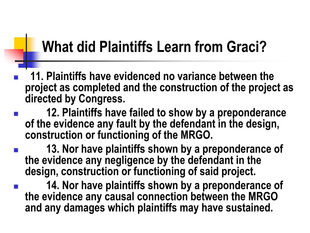 What did Plaintiffs Learn from Graci? • 11. Plaintiffs have evidenced no variance between the project as completed and the construction of the project as directed by Congress. • 12. Plaintiffs have failed to show by a preponderance of the evidence any fault by the defendant in the design, construction or functioning of the MRGO. • 13. Nor have plaintiffs shown by a preponderance of the evidence any negligence by the defendant in the design, construction or functioning of said project. • 14. Nor have plaintiffs shown by a preponderance of the evidence any causal connection between the MRGO and any damages which plaintiffs may have sustained.