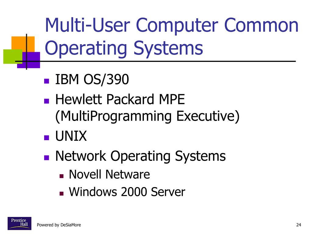 Multi-User Computer Common Operating Systems • IBM OS/390 • Hewlett Packard MPE (MultiProgramming Executive) • UNIX • Network Operating Systems • Novell Netware • Windows 2000 Server Powered by DeSiaMore