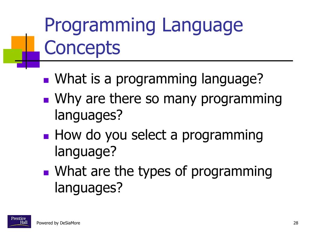 Programming Language Concepts • What is a programming language? • Why are there so many programming languages? • How do you select a programming language? • What are the types of programming languages? Powered by DeSiaMore