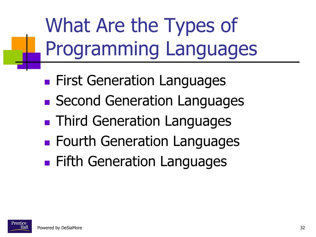 What Are the Types of Programming Languages • First Generation Languages • Second Generation Languages • Third Generation Languages • Fourth Generation Languages • Fifth Generation Languages Powered by DeSiaMore