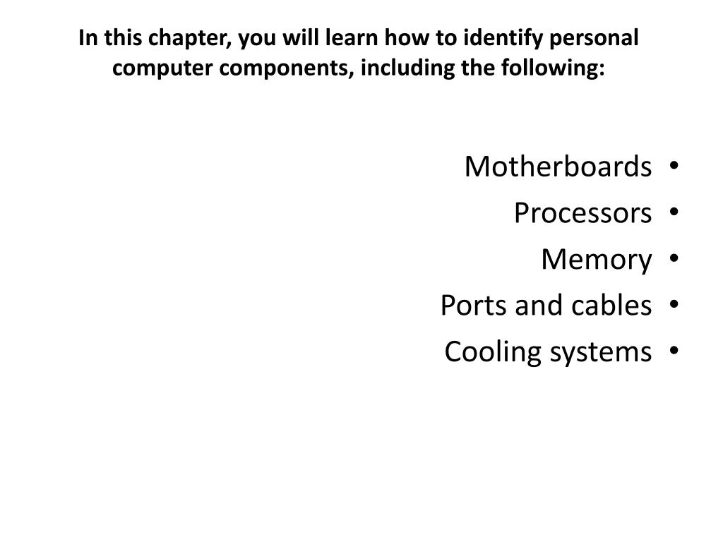 In this chapter, you will learn how to identify personal computer components, including the following: • Motherboards • Processors • Memory • Ports and cables • Cooling systems