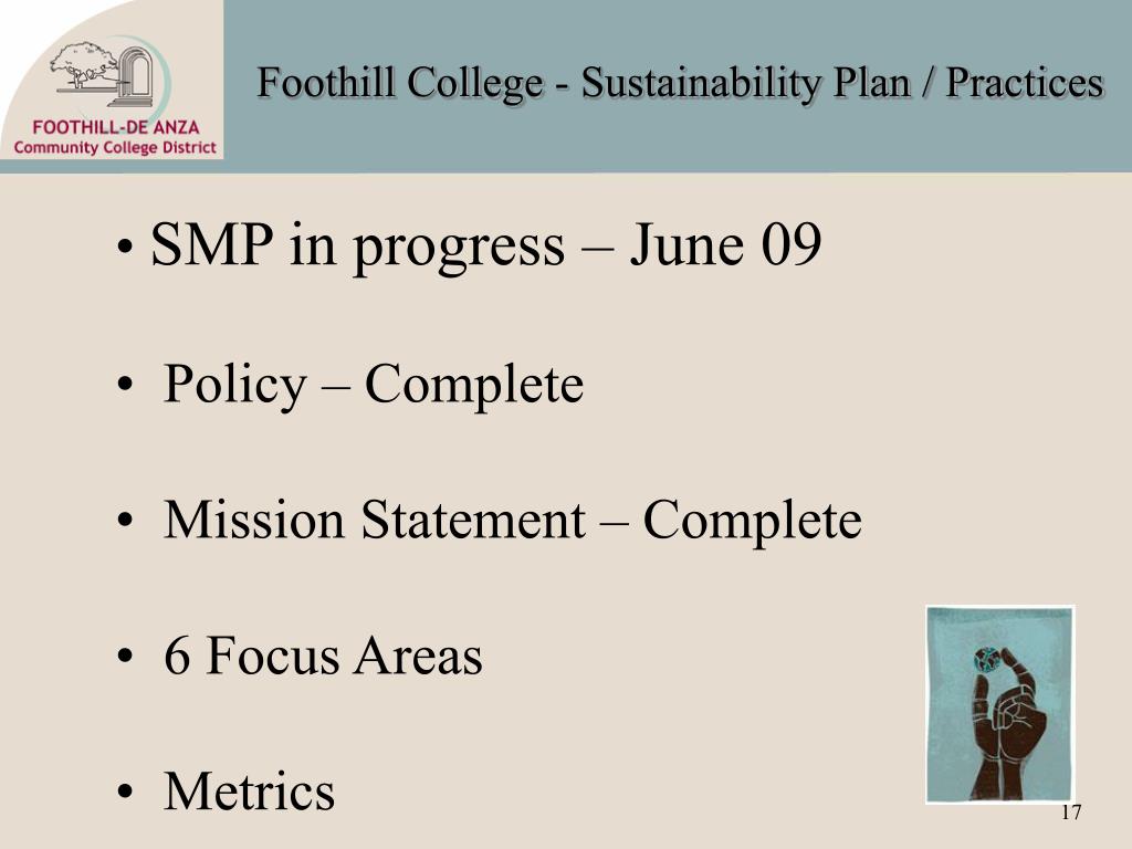 Foothill College - Sustainability Plan / Practices • SMP in progress – June 09 • Policy – Complete • Mission Statement – Complete • 6 Focus Areas • Metrics